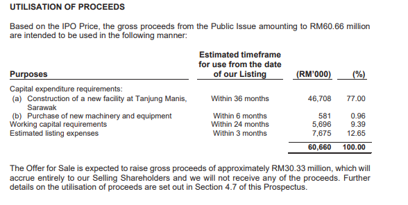 Pembinaan fasiliti pengilangan baharu di Tanjung Manis, Sarawak (~77 % daripada hasil IPO) untuk meningkatkan kapasiti pengeluaran.