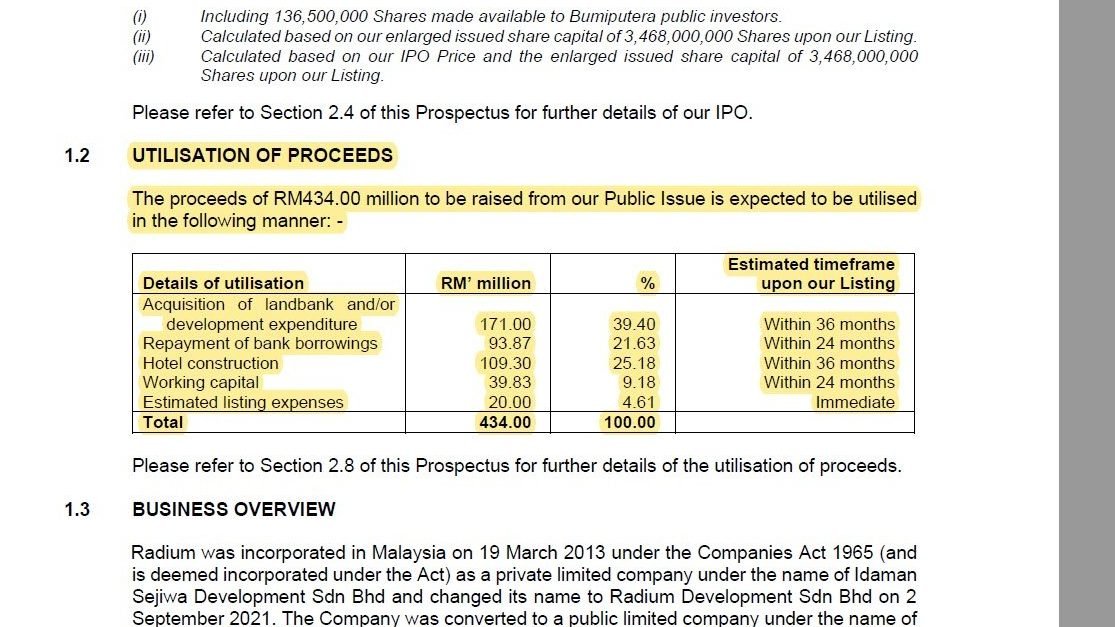Sebanyak 39.4% daripada duit yang diperolehi akan digunakan untuk menambah landbank dia dan juga development. Sebanyak 21.63% digunakan untuk membayar hutang. 25% akan digunakan dalam pembinaan hotel, satu sektor yang akan diceburi oleh syarikat ni. Selebihnya adalah untuk working capital dan listing expenses.