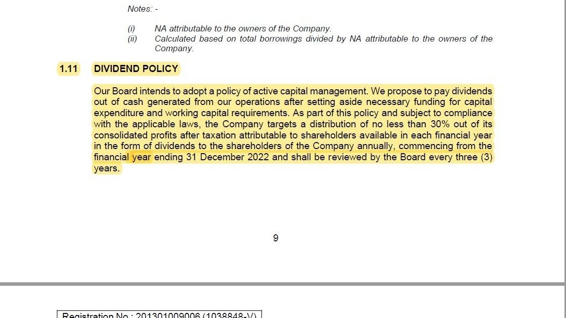 Syarikat juga ada membuat dividend policy di mana syarikat akan memberikan sekurang-kurangnya 30% daripada keuntungan syarikat kepada pemegang saham.