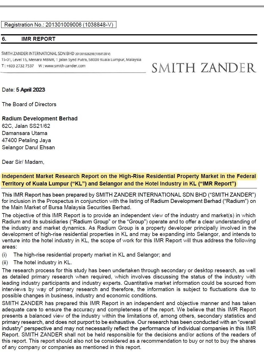 Dalam prospektus ada bahagian IMR Report. IMR merupakan singkatan bagi ‘independent market research‘. Laporan IMR dibuat agar dapat membantu memberikan satu analisis yang tak biased kepada para pelabur. Untuk syarikat Radium, IMR dibuat oleh Smith Zander.