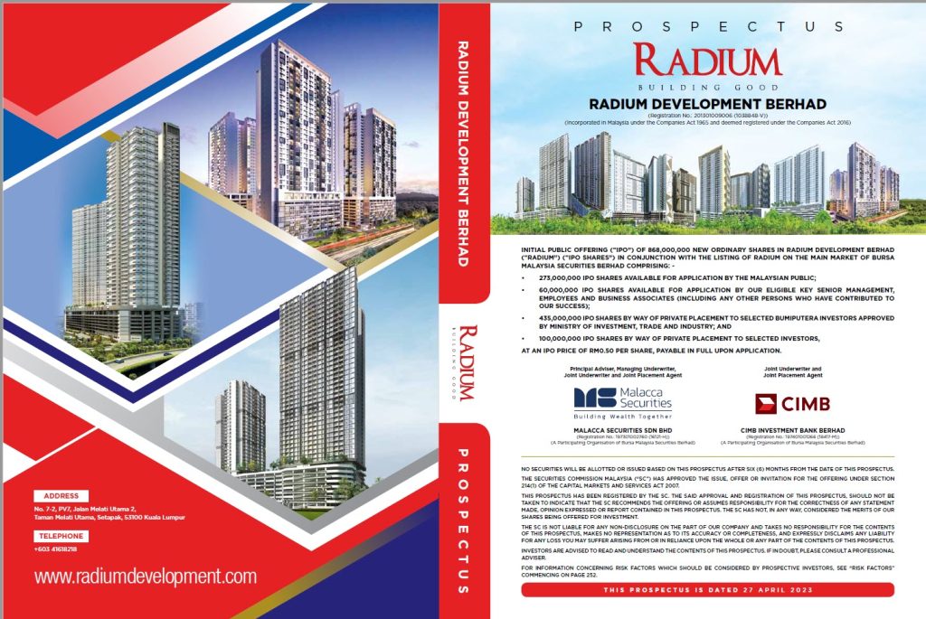 Daripada muka depan prospektus Radium Development Berhad diatas, dapat kita ketahui bahawa yang bertanggungjawab untuk menguruskan IPO ini, bawa syarikat ini ke Bursa Malaysia adalah Malacca Securities Sdn Bhd, dengan kerjasama CIMB Investment bank Berhad sebagai Joint Underwriter dan Joint Placement Agent.