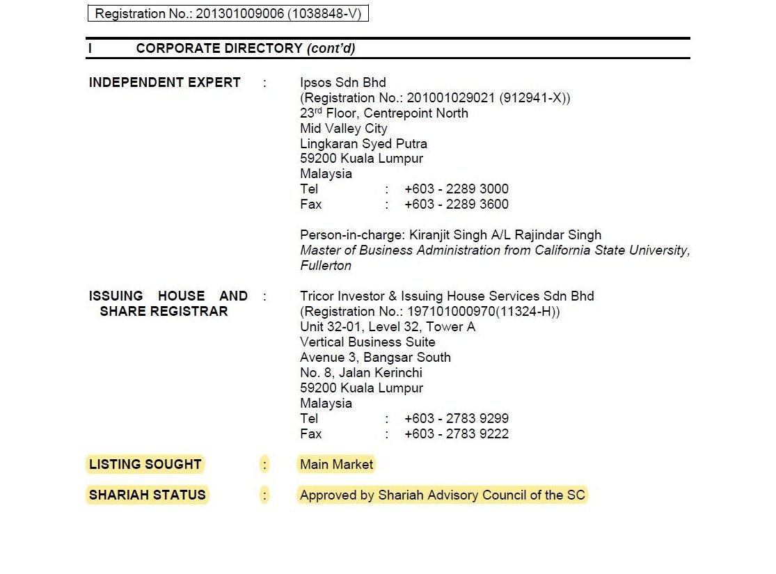 Melalui ‘Corporate Directory’, tahulah kita bahawa syarikat ini akan disenaraikan pada ‘Main Market’ ataupun ‘papan utama’ Bursa Malaysia. Dia juga sudah dikategorikan sebagai ‘patuh syariah’ oleh Shariah Advisory Council.
