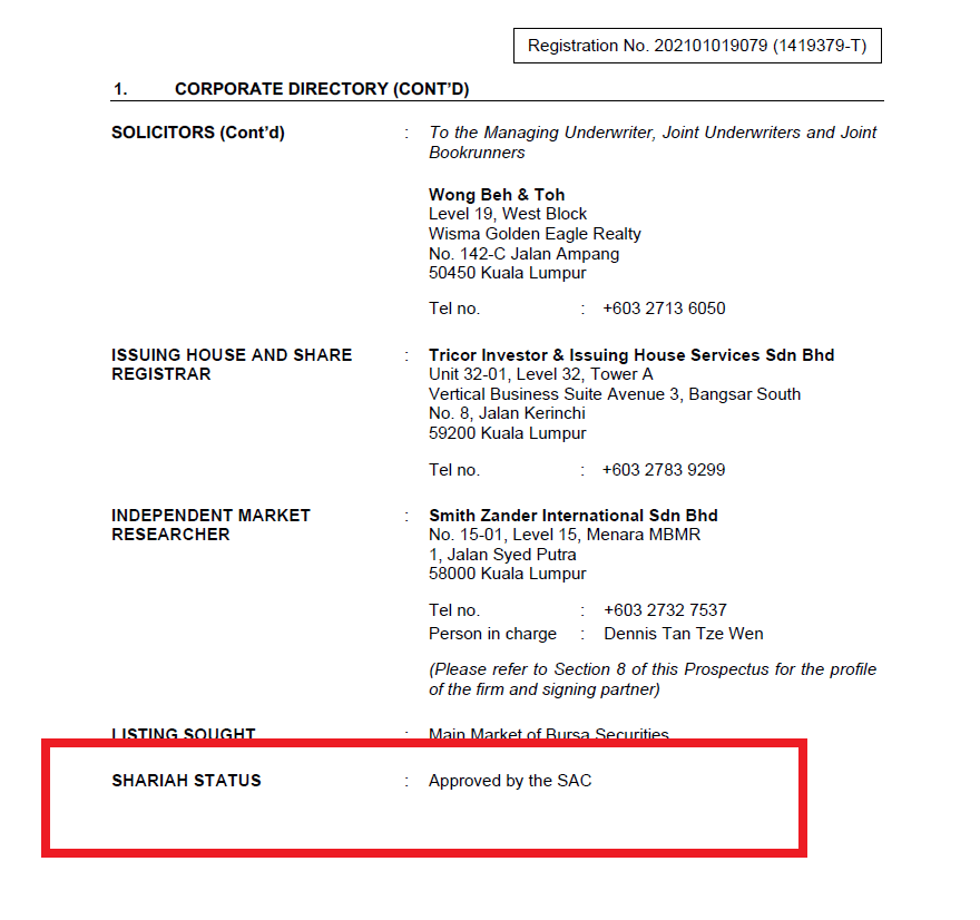 Berdasarkan prospectus, IPO ini mendapat shariah dari Shariah Advisory Council of SC