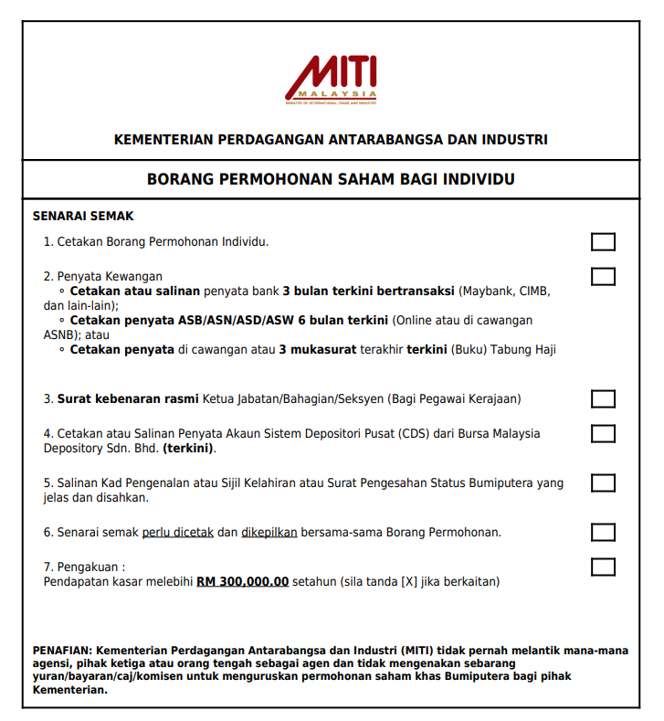Anda perlu log masuk ke laman MITI, lengkapkan borang permohonan dengan nombor akaun CDS, dan hantar sebelum tarikh tutup. Pastikan akaun CDS anda aktif dan mempunyai baki mencukupi.