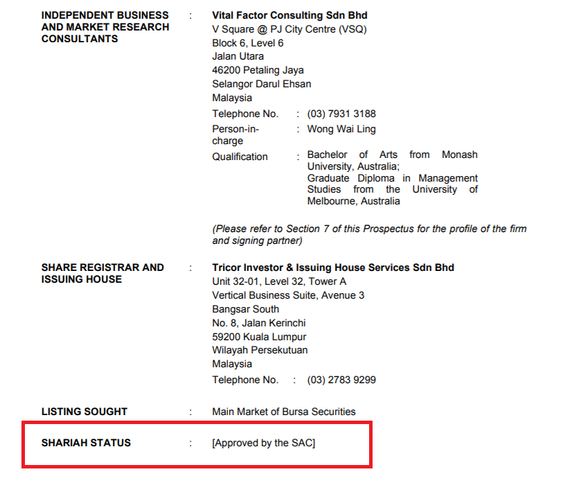 Berdasarkan prospectus, IPO ini mendapat shariah dari Shariah Advisory Council of SC