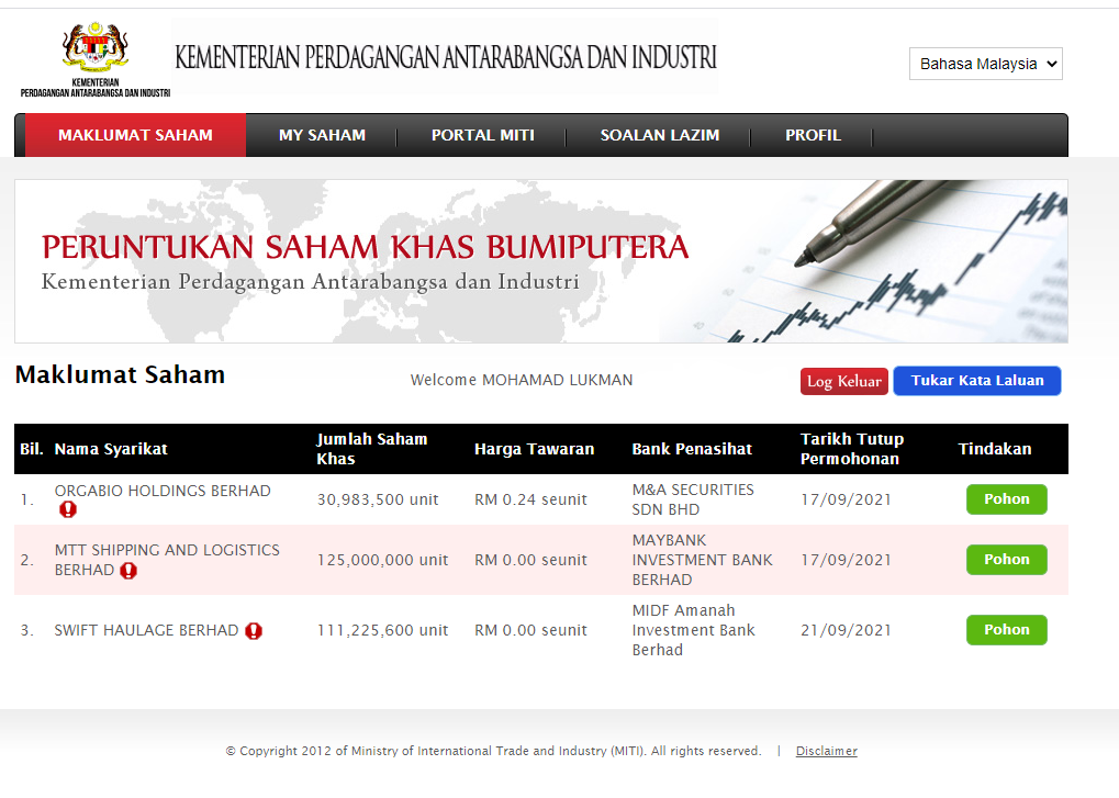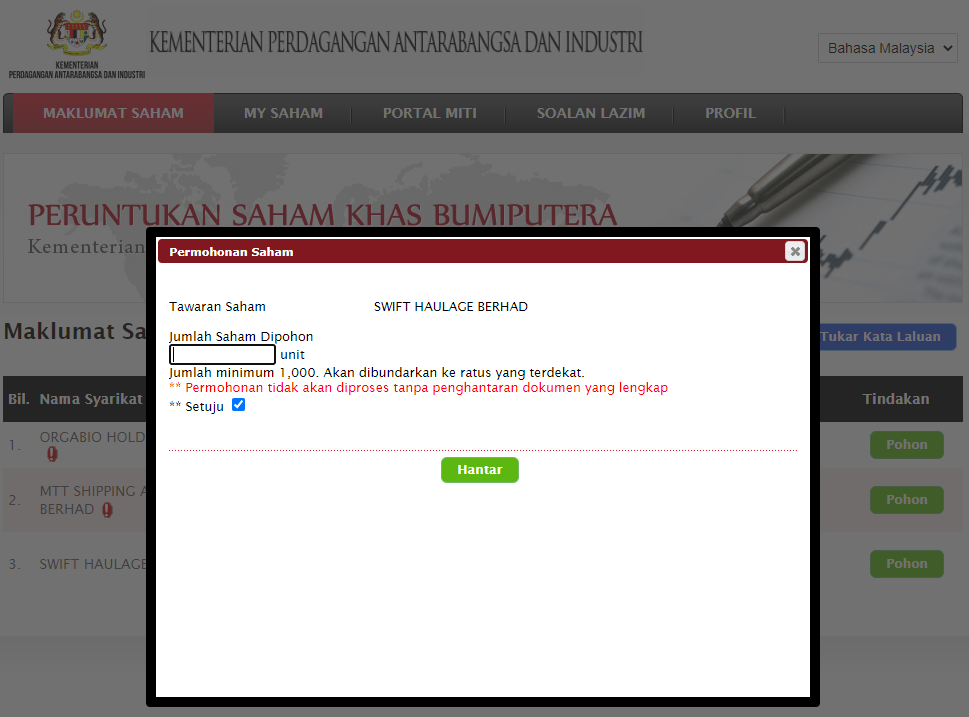 Ketiga selepas login akan keluar maklumat IPO terkini. Untuk sekarang adalah Swift Haulage Berhad, ORGABIO HOLDINGS BERHAD dan MTT Shipping and Logistics Berhad. Jika nak memohon klik butang hijau iaitu POHON untuk Swift Haulage Berhad.