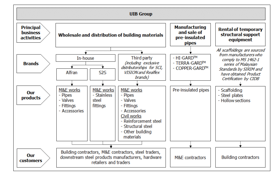 Aktiviti utama syarikat adalah dalam pemborongan dan pengedaran pelbagai jenis bahan binaan untuk pembinaan dan kerja-kerja pembinaan seperti paip, injap, kelengkapan dan aksesori untuk kerja-kerja M&E, keluli tetulang, keluli struktur dan bahan bangunan lain untuk kerja-kerja awam. Selain itu mereka juga terlibat dalam pembuatan dan penjualan paip pra-penebat yang digunakan terutamanya mengangkut dan mengekalkan suhu bendalir dalam paip di bawah tanah atau sistem paip di atas tanah. Ia digunakan dalam pelbagai industri, komersial dan aplikasi domestik seperti sistem penghawa dingin, pemanasan elektrik, perindustrian pemprosesan serta penyimpanan dan pengalian minyak.