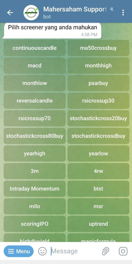 Antara screener yang ada dalam Mahersaham Support Bot adalah :