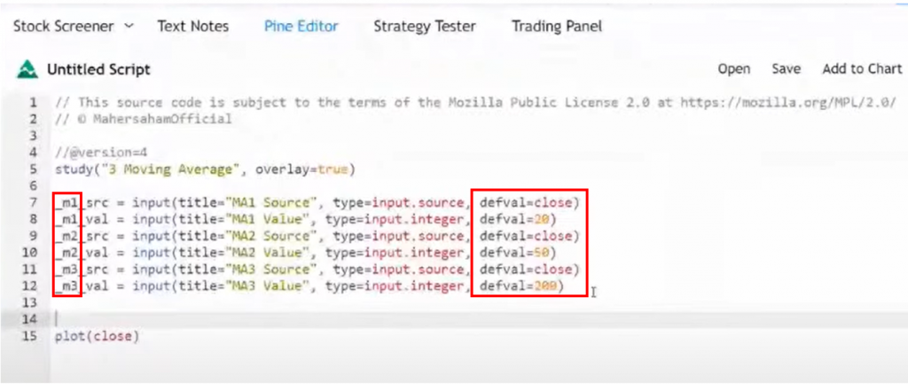 Berdasarkan gambar di atas, anda hanya perlu follow sahaja pine script yang dah Mahersaham tunjukkan di atas.