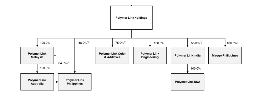Polymer Link mempunyai syarikat subsidiari di beberapa negara untuk menyokong operasi dan pengedaran produk, termasuk Malaysia, Filipina, India, Australia dan USA.