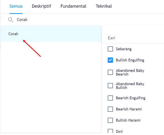 Search for pattern in the filter search bar and you can select bullish engulfing or any other pattern you want to analyse.