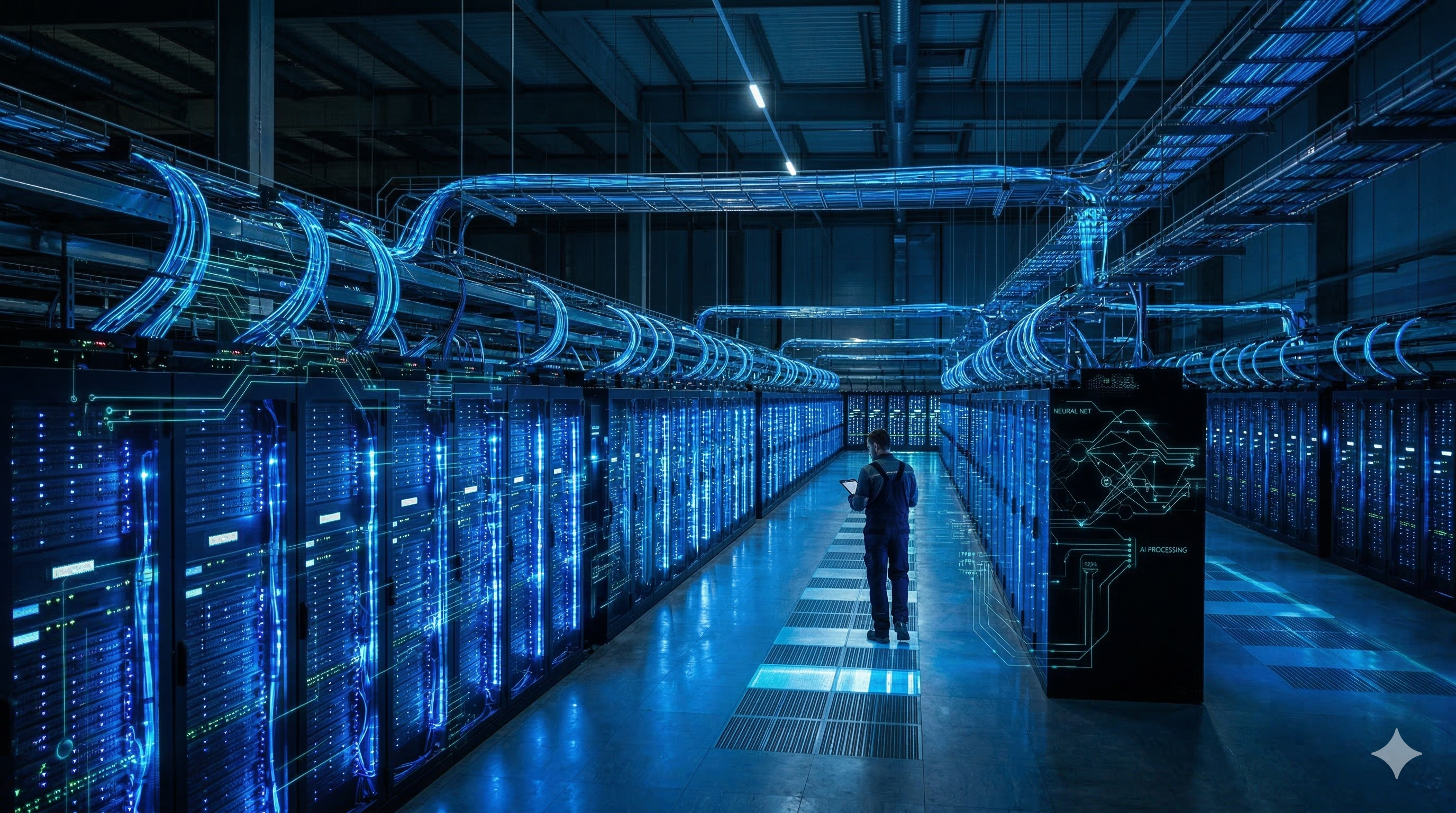 Di sinilah cip-cip itu tinggal. Fasiliti skala gudang yang gergasi, diisi dengan pelayan, dihubungkan oleh rangkaian berkelajuan tinggi, dan disejukkan oleh sistem pengurusan terma yang semakin canggih.