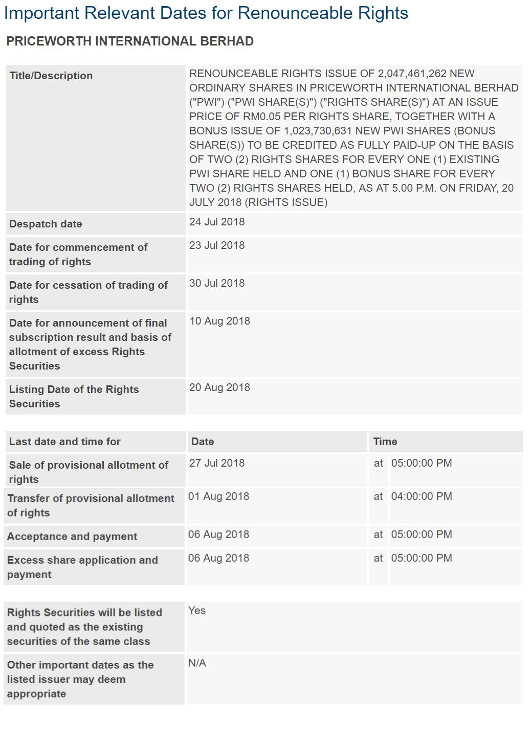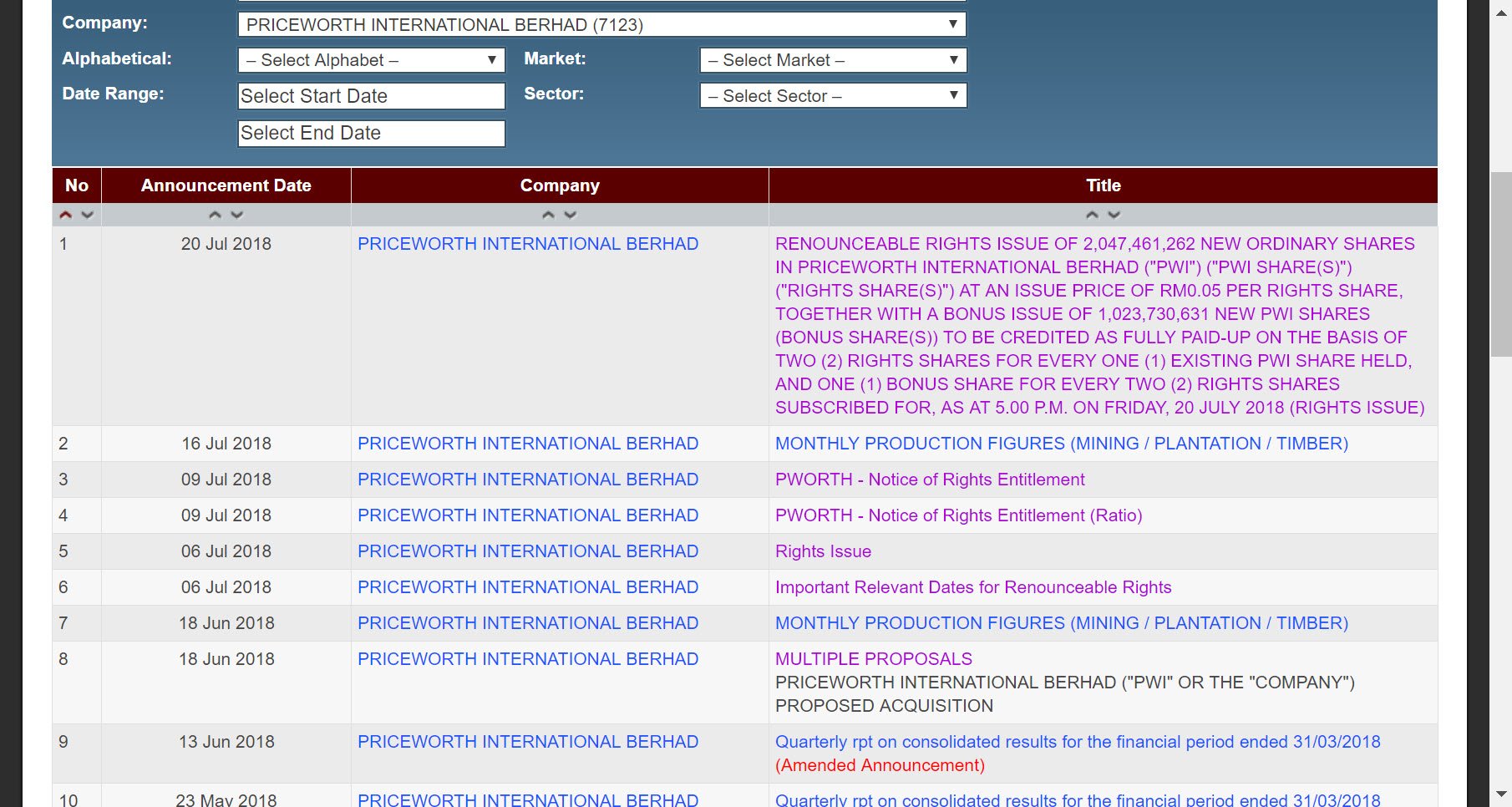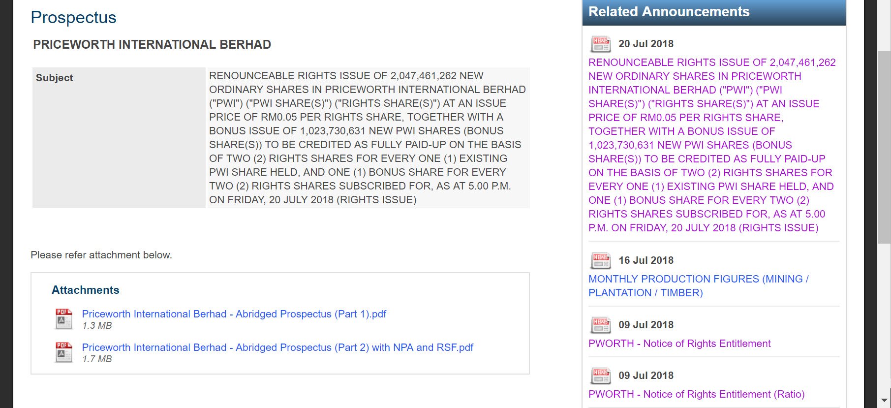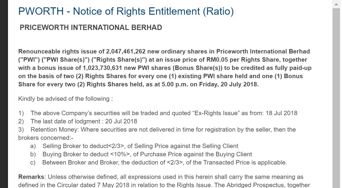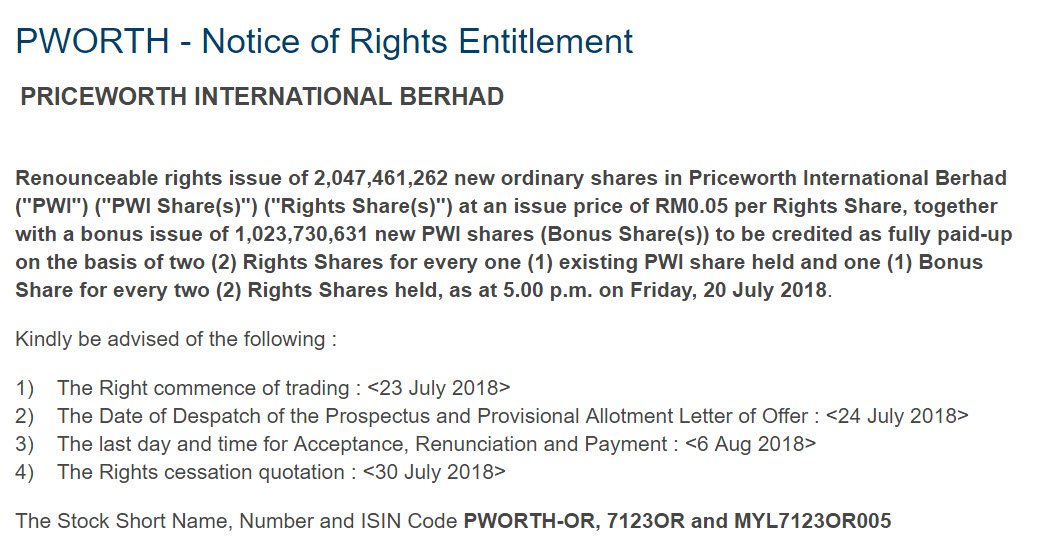 Saham Priceworth baru-baru ini telah mengalami gap down yang ketara pada 18 julai 2018. Hal ini dikaitkan dengan pemberian rights issue dan bonus shares yang dilaksanakan oleh PWORTH.