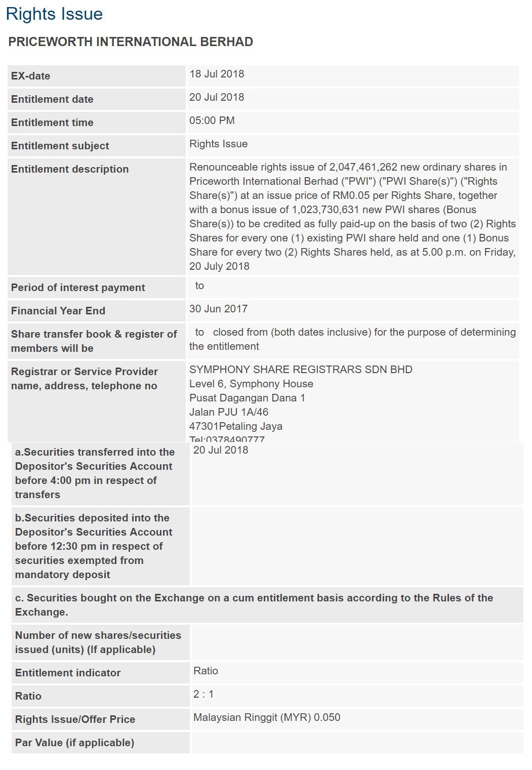 06 Jul 2018 – “Rights Issue”