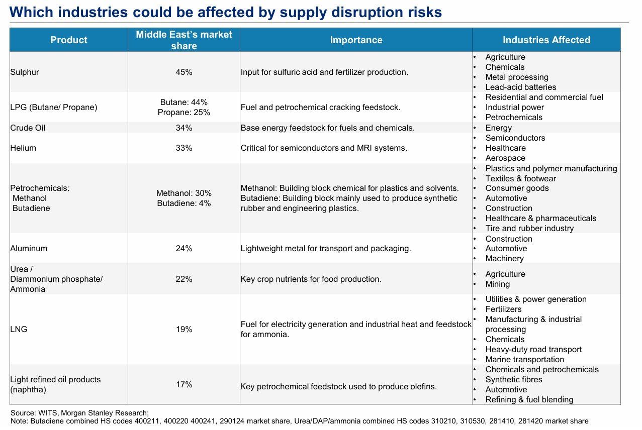 Data daripada WITS dan Morgan Stanley Research menunjukkan bahawa sekurang-kurangnya 9 produk utama mempunyai kebergantungan tinggi kepada Timur Tengah. Artikel ini membedah satu persatu produk tersebut, sejauh mana penguasaan Timur Tengah dalam pasaran global, dan industri mana yang bakal terkesan paling teruk jika gangguan bekalan berlaku.