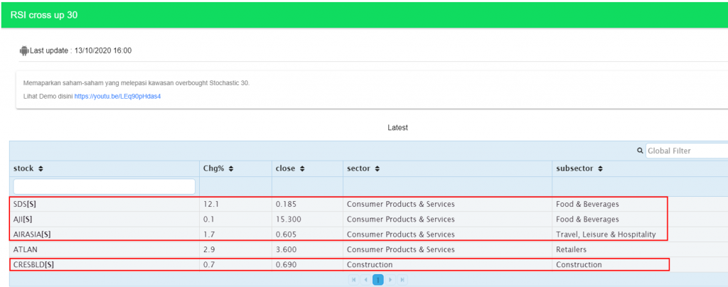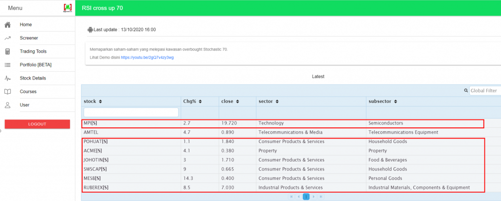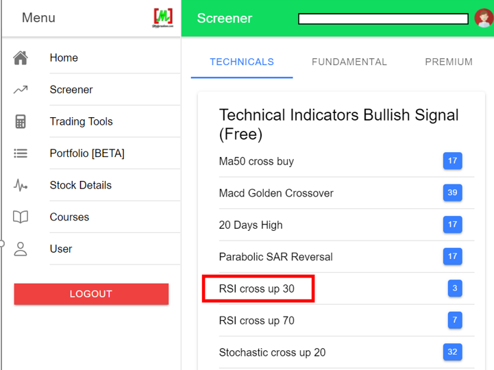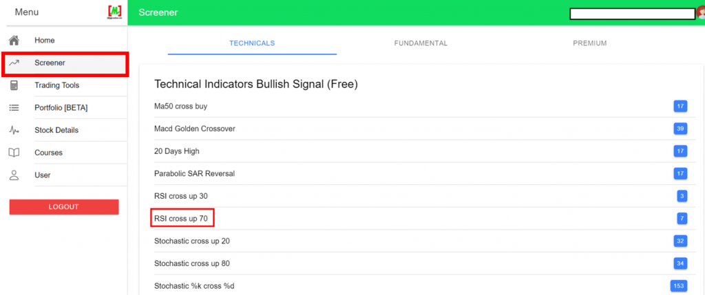 Log in to the Mahersaham web app at app.mahersaham.com, navigate to the screener section, and select either the RSI cross up 30 (oversold reversal) or RSI cross up 70 (overbought) indicator. The screener will display a list of counters matching that criteria, with Shariah-compliant stocks marked with an [S] symbol.