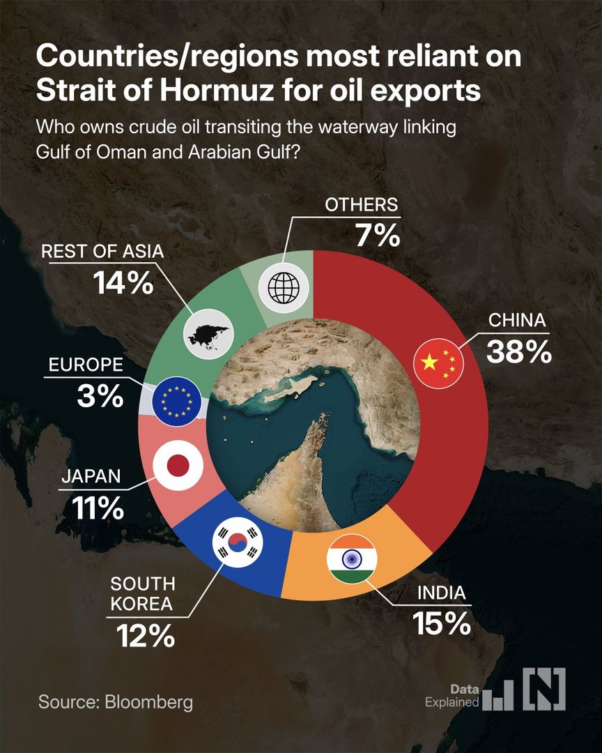 Berdasarkan data Bloomberg, China adalah negara yang paling bergantung dengan 38% daripada semua minyak yang melalui Selat Hormuz adalah miliknya โ bersamaan kira-kira 8 juta tong sehari.