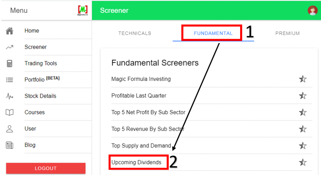 Next, click on the screener button in the red box. Then click on fundamental and select upcoming dividends.