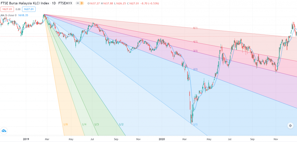 Kita akan dapat satu garisan dengan menggunakan Gann Fan. Selain itu kita juga dapat garisan untuk 8/1, 4/1, 3/1, dan 2/1.