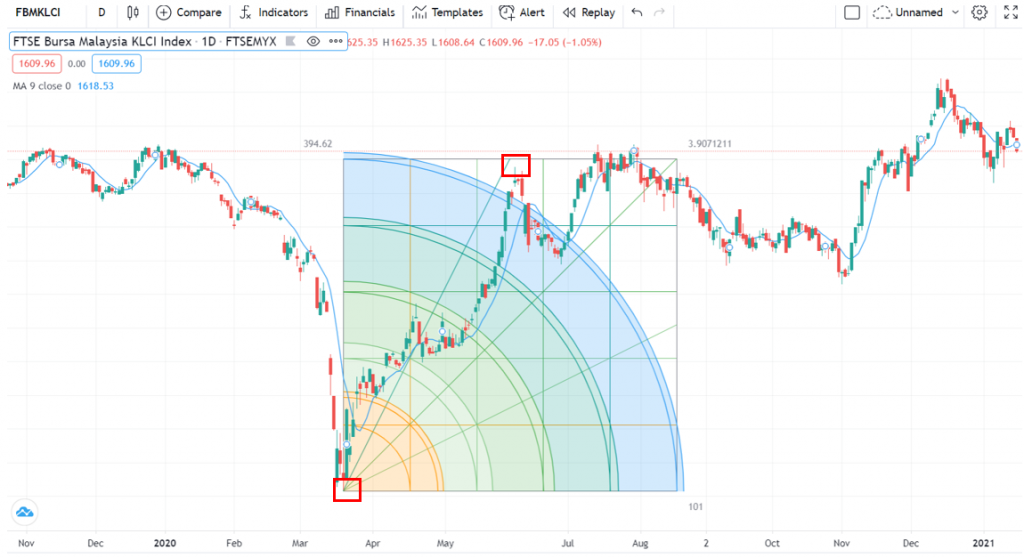 Berdasarkan gambar di atas dalam kotak merah itu adalah low dan high. Menggunakan Gann Square kita perlu adjust untuk dapatkan best fit