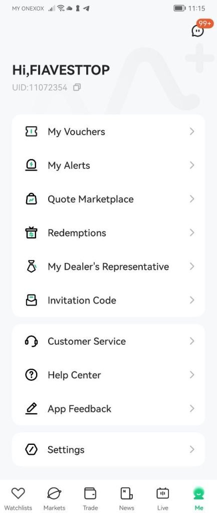 Anda boleh menukar tetapan bahasa melalui tab 'Settings' di bahagian bawah aplikasi. Di sana terdapat pilihan untuk Account dan Security, Trade Preference serta tetapan lain termasuk pilihan bahasa.