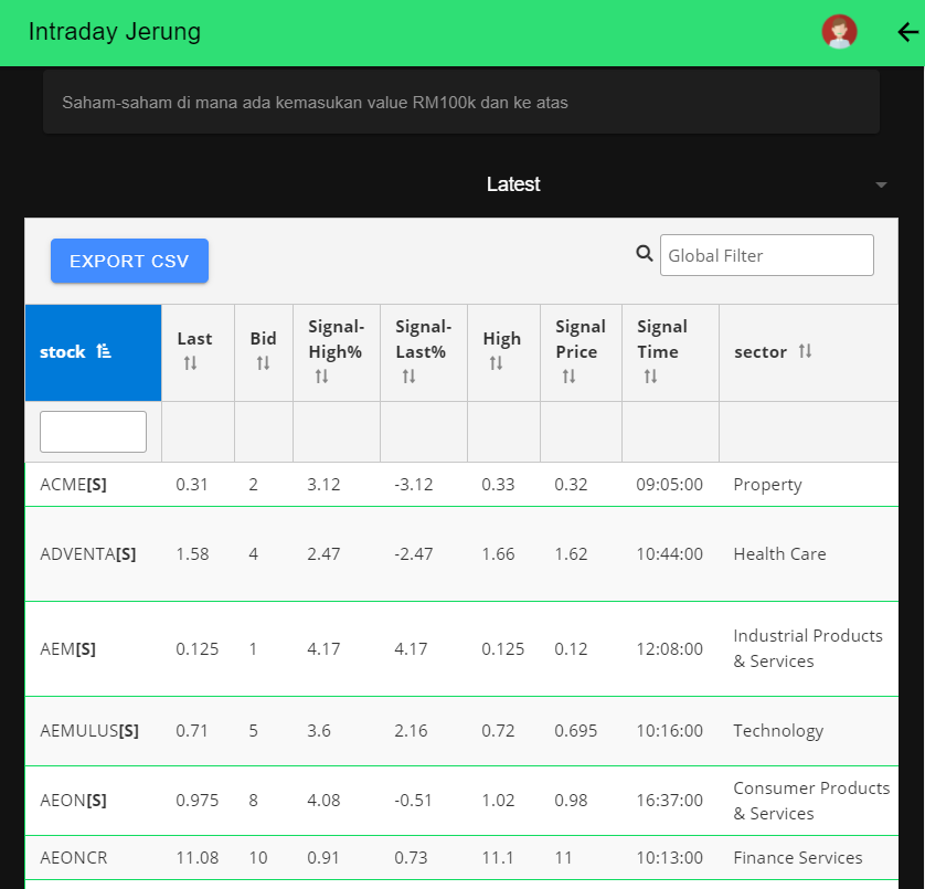 Intraday jerung nie berfungsi untuk kita lihat kaunter-kaunter mana yang ada kemasukan jumlah duit yang banyak ataupun orang beli saham dengan amount yang tinggi at least lebih daripada RM100,000 ringgit.