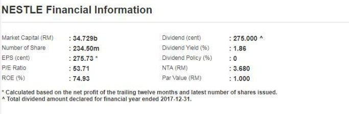 Nestle has a market capital worth RM34.729 billion. This is equivalent to 234.5 million units of shares (Number of Shares) multiplied by the stock price, which at the time this image was captured was RM148.