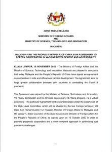 Vaksin COVID-19: Malaysia-China tandatangan perjanjian kerjasama