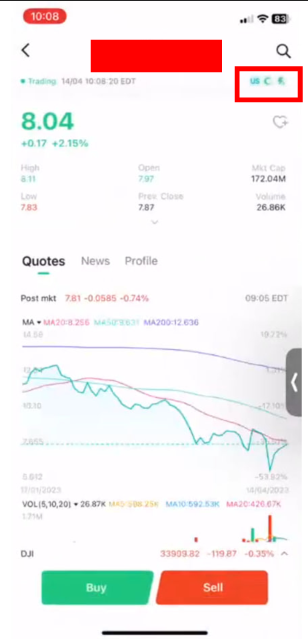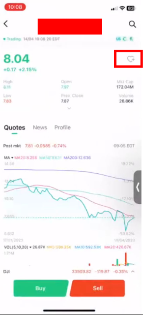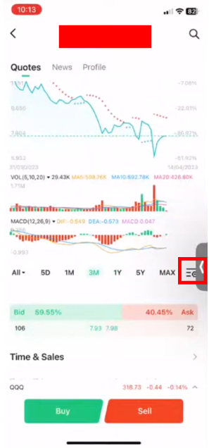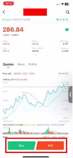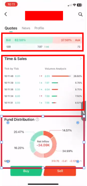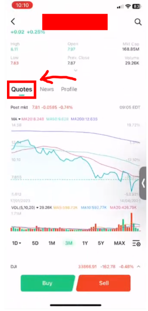 Butang yang paling penting sekali juga berada pada paparan ini. Untuk membeli saham tersebut, anda boleh tekan butang buy, dan tekan butang sell untuk menjual.