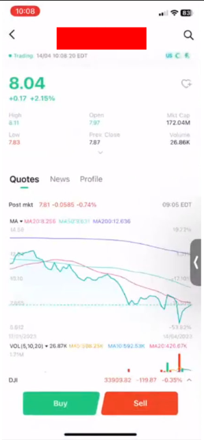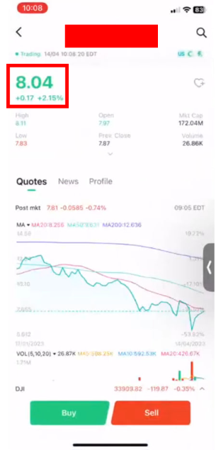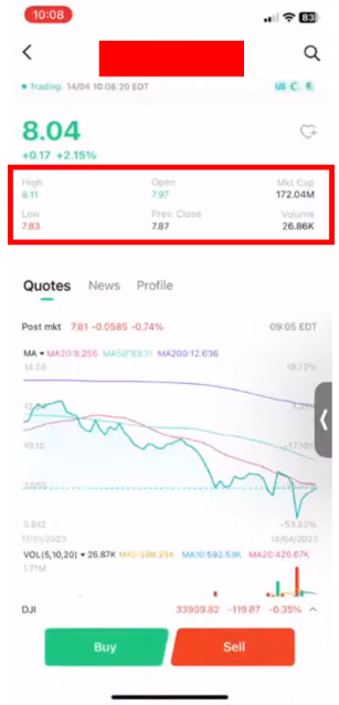 Harga saham semasa ialah 8.04 USD. Peningkatan sebanyak 0.17 USD berbanding hari semalam bersamaan 2.15%. Warna hijau menunjukkan peningkatan berbanding hari semalam. Sekiranya berwarna ‘merah’, ini menunjukkan penurunan harga, lebih rendah berbanding semalam.