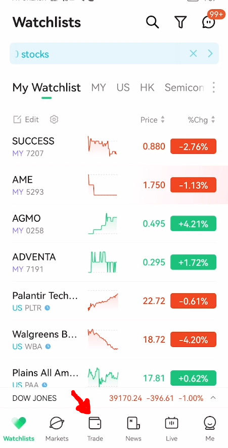 Untuk mencari kaunter, tekan bahagian search yang menunjukkan ‘Name/Symbol’. Perlu diingat, kita hanya boleh menjual kaunter yang kita sedang miliki sahaja.