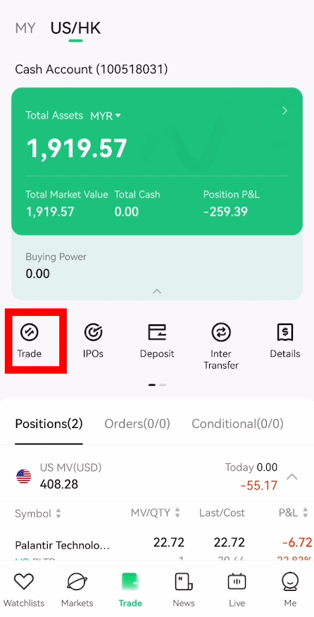 Selepas masuk ke paparan Trade, langkah seterusnya ialah tekan ‘Trade‘ seperti yang ditanda kotak merah dalam gambar diatas.