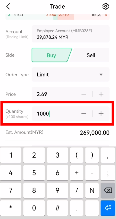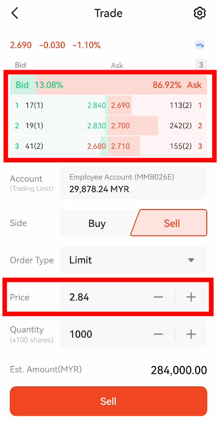 Jika anda ingin memilih harga jualan berdasarkan market depth (kotak atas), anda boleh terus tekan ke harga tersebut, maka bahagian ‘price’ (kotak bawah) akan bertukar mengikut harga yang anda tekan.