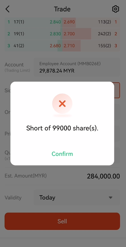 Sebagai contoh, jika anda hanya mempunyai pegangan saham sebanyak 10 lot (bersamaan 1000 unit), tapi dibahagian ‘quantity’ anda letak 1000 lot (bersamaan 100,000 unit), maka akan keluar popup memberitahu kita kekurangan saham untuk dijual (seperti gambar dibawah).