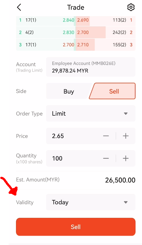 Selepas yakin dengan harga yang ingin dijual, jenis order, bilangan lot dan validity, seterusnya boleh tekan ‘Sell’ yang berada dalam kotak merah untuk teruskan penjualan.