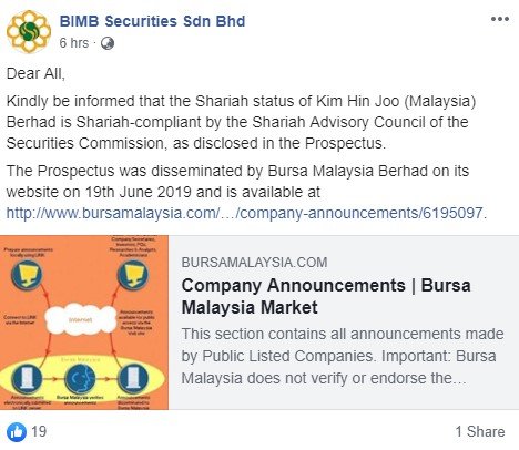Bagi muslim status syariah sangat penting dalam menjaga harta kita. Untuk IPO KIM HIN JOO Berhad ini ia berstatus patuh syariah berdasar sumber di ambil dari laman facebook BIMB SECURITIES Sdn Bhd.