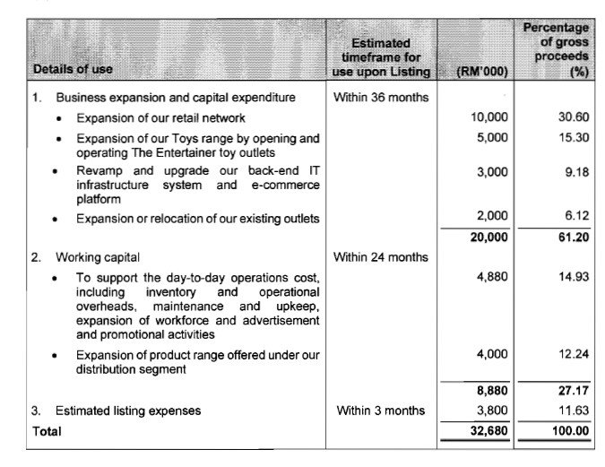Manakala untuk “Expansion of Our Toys Range” mereka memerlukan 5 juta iaitu 15.3% untuk membuka Kedai Mainan untuk kanak-kanak. Mereka bercadang untuk buka sekurang-kurangnya 3 atau 4 outlets.