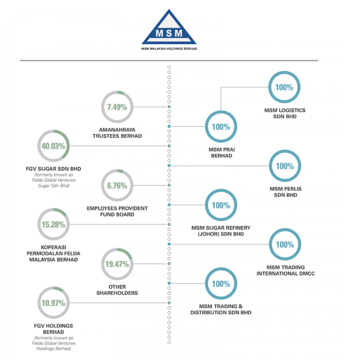 Bersumberkan laman web BursaMarketPlace, Felda Global Ventures Holdings Sdn Bhd (FGV) merupakan pemegang saham terbesar MSM Malaysia Holdings iaitu sebanyak 51%.