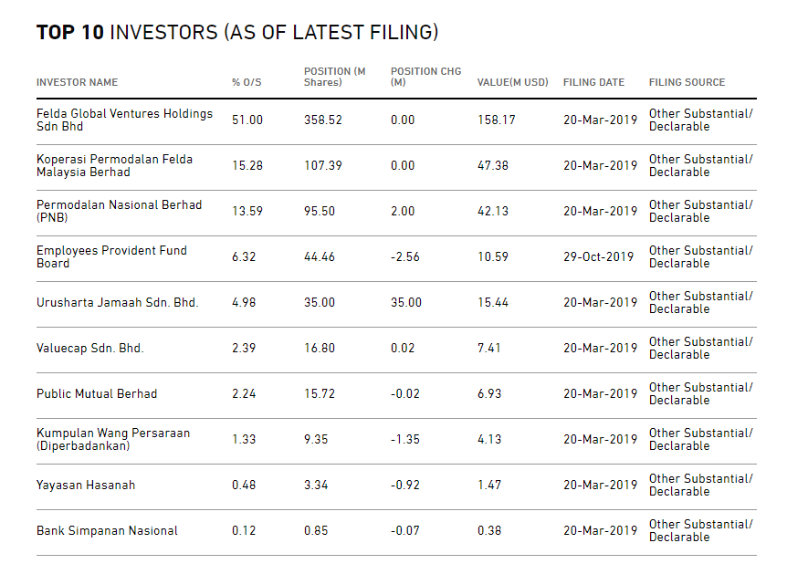 Berikut merupakan pecahan 5 institusi pegangan saham terbesar dalam MSM: