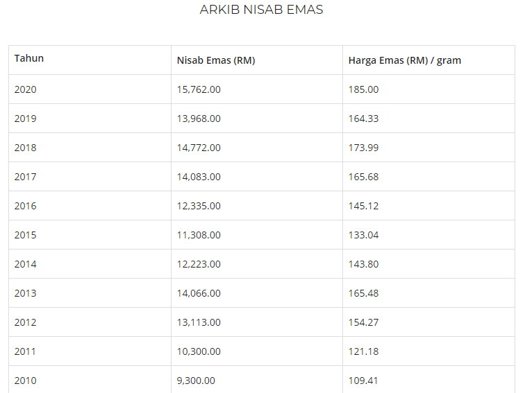 Untuk tahu kadar nisab ini ditentukan oleh purata harga 85 gram emas pada setiap tahun seperti berikut: