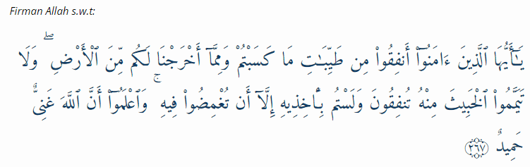 ‘Wahai orang-orang yang beriman! Belanjakan (zakat) sebahagian hasil usaha kamu yang baik-baik, dan sebahagian dari apa yang kami keluarkan dari bumi untuk kamu’